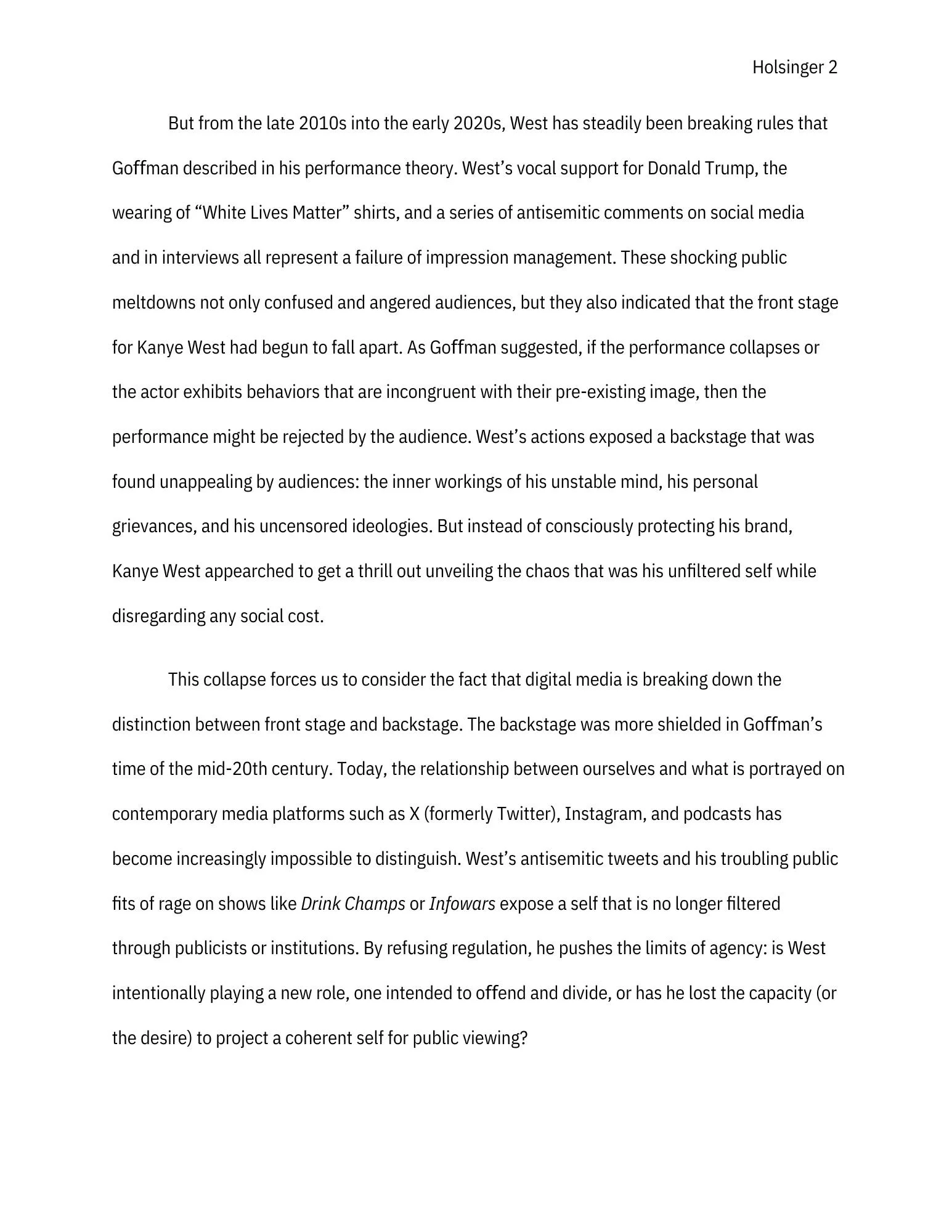 Kanye West and the Fall of the Performed Self: A Goffmanian Analysis Nov 14 Written By Sophie Kadan by Luke Holsinger Sophie Kadan