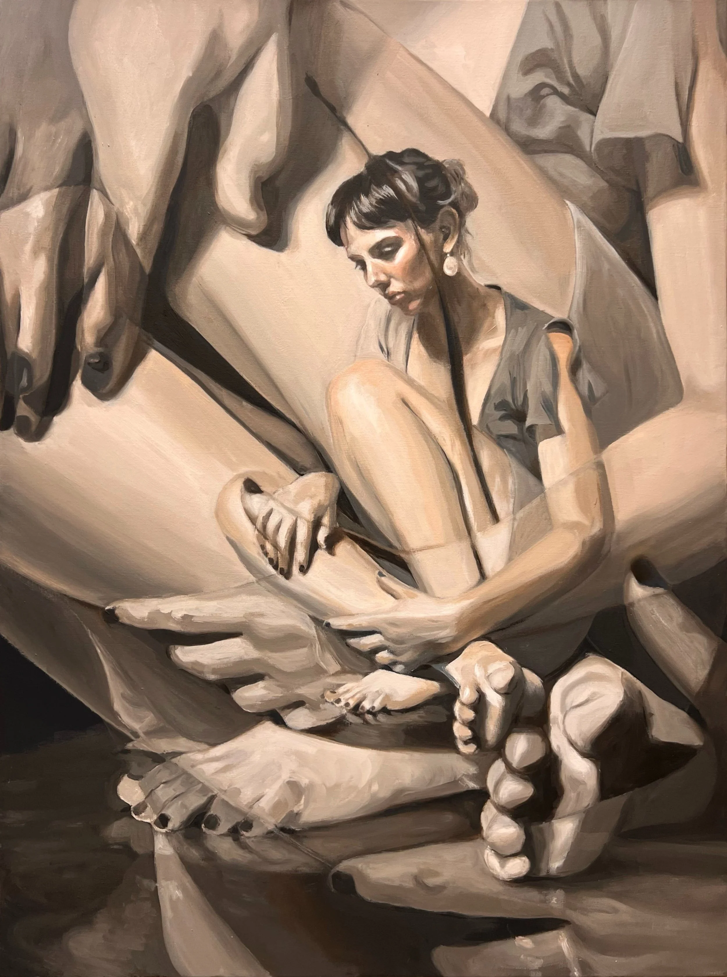 Based in Philadelphia, Marlaina Schiman is an oil painter and fine artist. She studied at both Temple and Rowan University, earning her B.F.A at the latter. Working predominantly figuratively, her pieces show themes of intimacy, alienation, and liberation, focusing on individual subjects juxtaposed against themselves or parts of themselves, frequently in indistinct and liminal spaces. She is fascinated by the effects of transparency, playing with light and shadow, and experimenting with trends from art history. She is currently working on a body of work about body image issues, eating disorders, sexual trauma, and gender socialization.